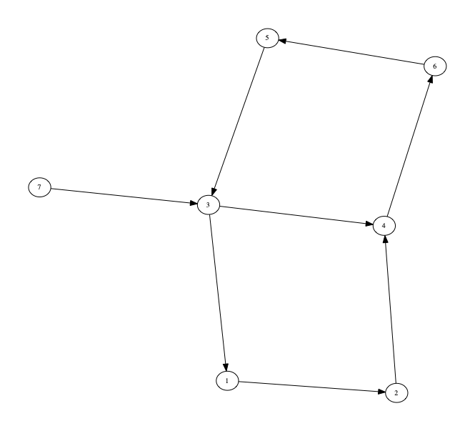 また、出力された行列を見ても、1〜6番の頂点から7番の頂点へのルート数が0となっていて、上のグラフとちゃんと対応していることも確認できます。
