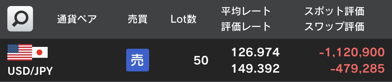 ・USD/JPY 売 5万通貨 @126.974 (評価損益 -1,600,185円)