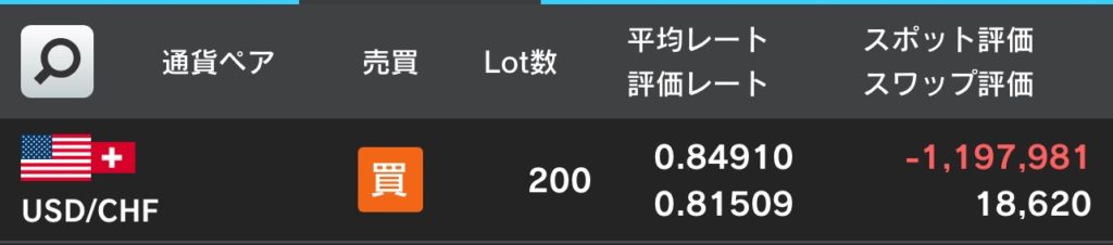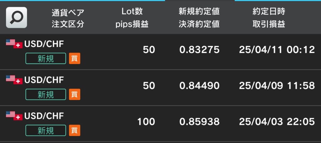 アメリカのトランプ大統領が関税を発表し、ドルスイスのレートが下がったことでこのポジションを仕込んだわけですが、