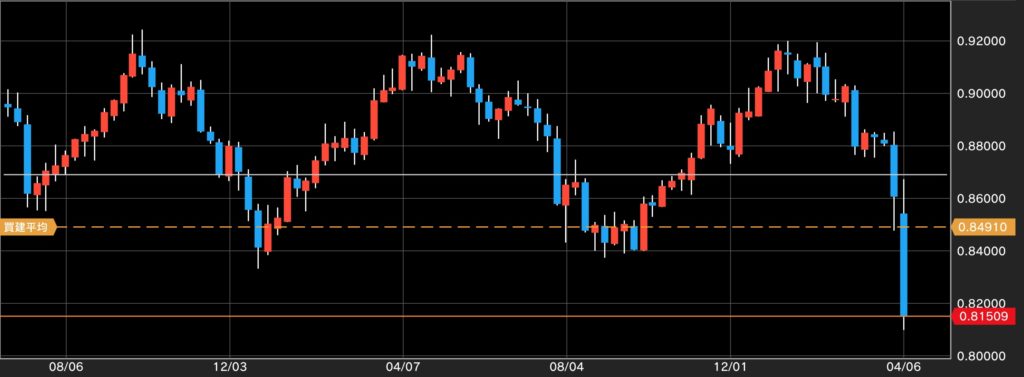 この関税による経済への影響が大きいと見られているようで、ドルスイスも0.84を簡単に割り込み、この記事執筆時現在では0.815まで下がってしまいました。