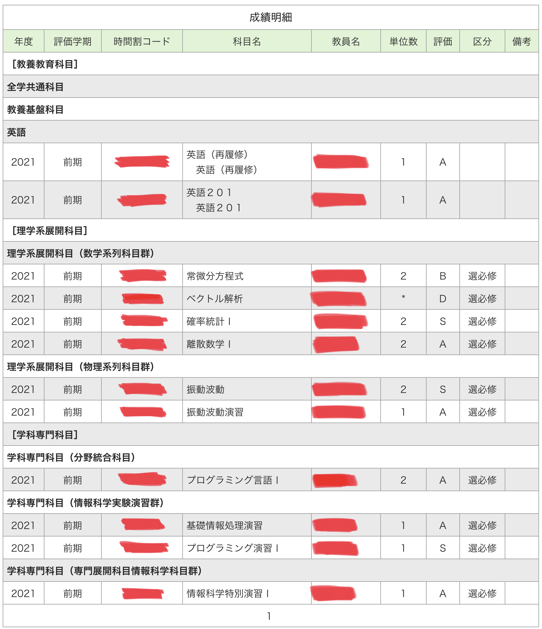 下に貼ったものが前期に取得した単位のスクショです。(評価はS、A、B、C、D(落単)の5種類)