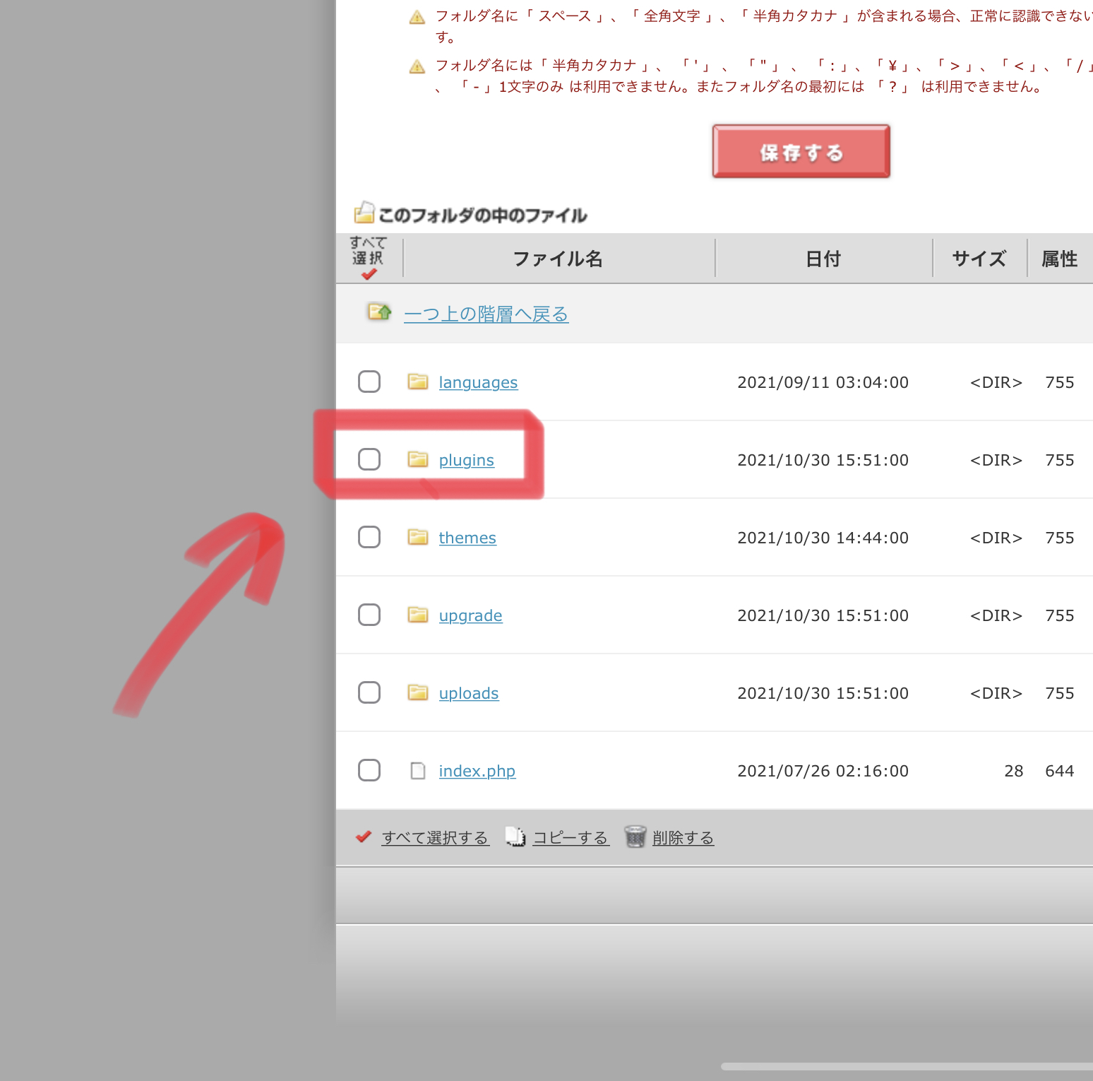「plugins」の中には名前通りインストールしたプラグインが入っているのでその中からログインURLを変更するプラグイン(私の場合は「SiteGuard WP Plugin」を入れていたので「siteguard」)にチェックを入れて、下の「削除する」をクリックします。