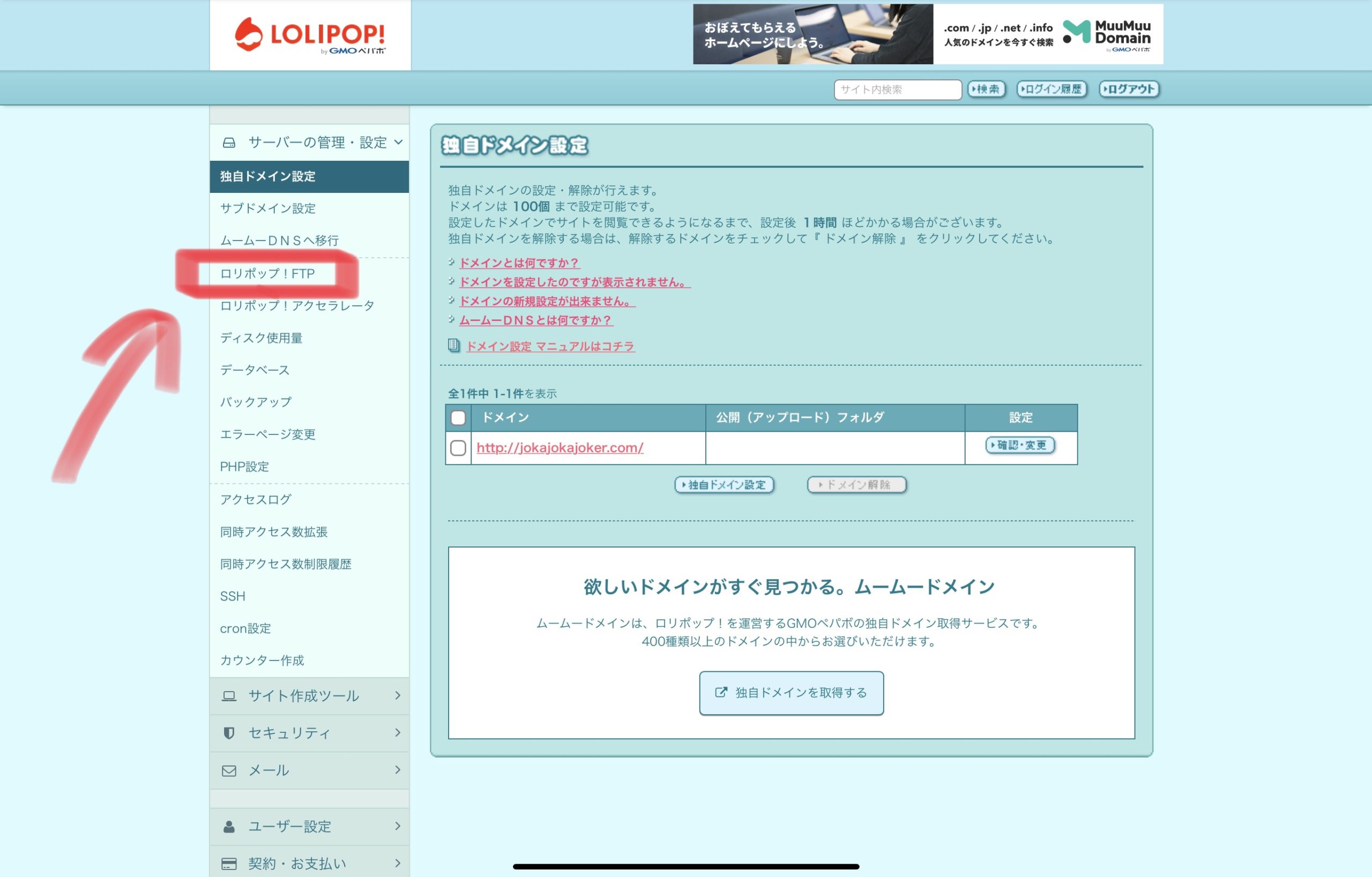 まずは、ロリポップにログインをして、FTPというものを開きます。
